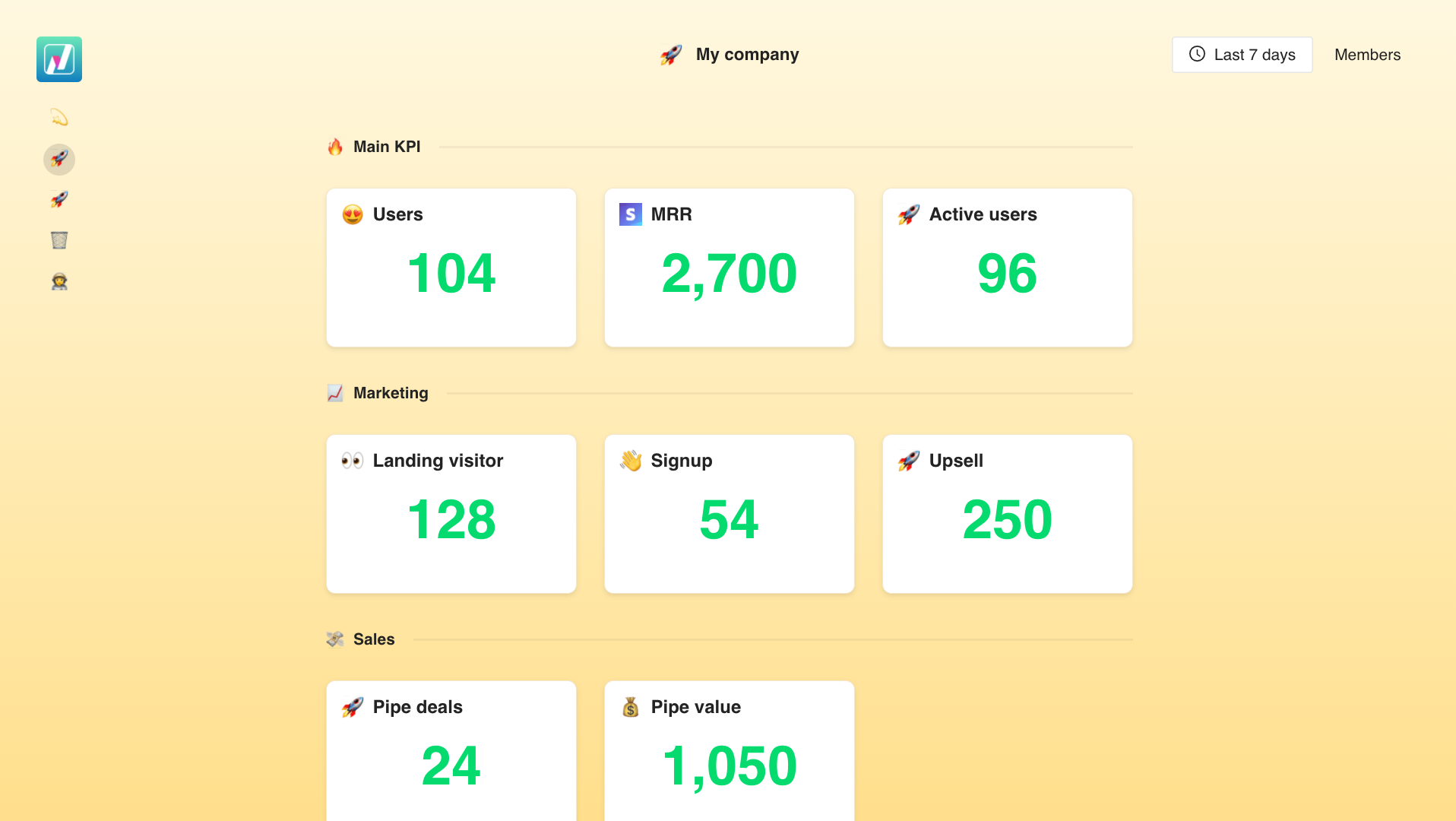 Overviews retrieves data from your SaaS tools and builds a unified view of your business. Give your team visibility by highlighting the right metrics.